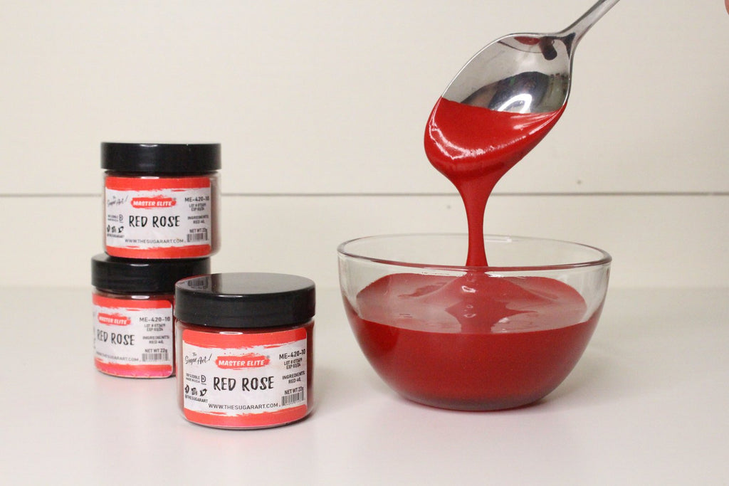 MASTER ELITE RED ROSE IS THE BEST RED FOOD COLOR FOR YOUR ICING THIS INDUSTRY HAS EVER SEEN! MASTER ELITES ARE INTENDED TO COLOR ROYAL ICING, FONDANT, BUTTERCREAM, MACARON BATTER, CAKE BATTER AND MORE! KEEP IN MIND, MASTER ELITES ARE NOT FAT SOLUBLE AND CANNOT COLOR CHOCOLATE.